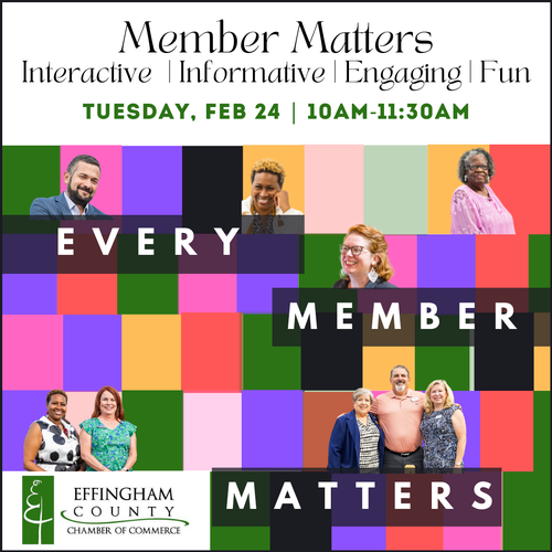 Event Description:Designed with our entire community in mind, Members Matter offers an engaging, interactive experience for current, new, and prospective members alike. Discover the wide range of events, innovative programs, impactful committees, cost-saving benefits, and professional development opportunities available through the Effingham County Chamber. Meet our dedicated staff, key organizational stakeholders, and fellow community leaders—and learn how to unlock the full potential of your membership!Location:Chamber Office