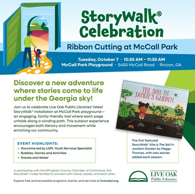 Name: Ribbon Cutting: StorywalkDate: October 7, 2025Time: 10:30 AM - 11:30 AM EDTWebsite: liveoakpl.orgRegistration: Register NowEvent Description:Ribbon‑Cutting Celebration: StoryWalk Launch at McCall Park